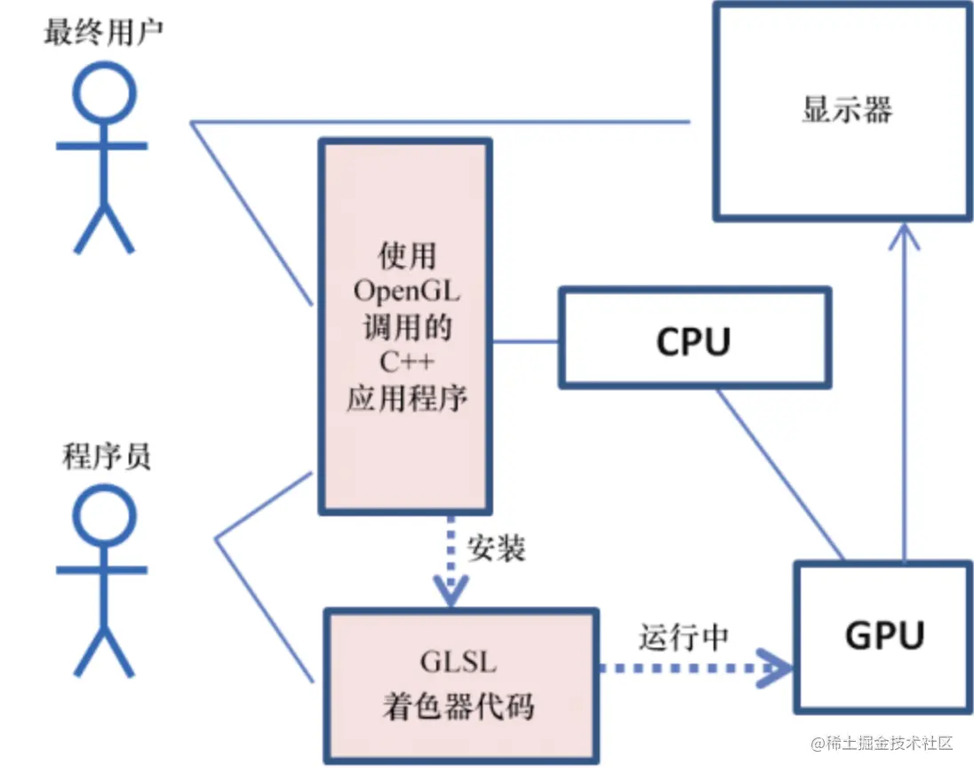 - 之前介绍过,使用C++语言编写的程序,可以调用OpenGL库接口,并最终运行在CPU上。