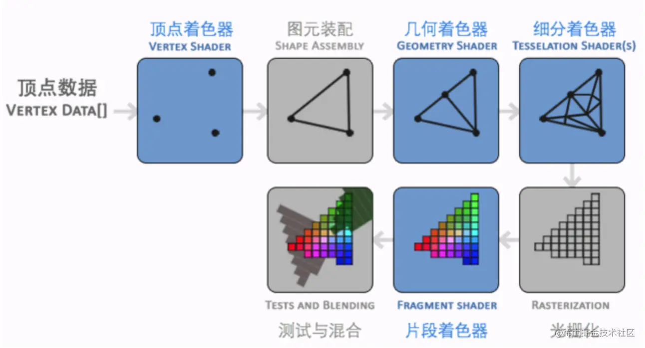 OpenGL管线主要阶段包括:顶点着色器 > 图元装配 > 几何着色器 > 曲面细分着色器 > 光栅化 > 片段着色器 > 像素操作