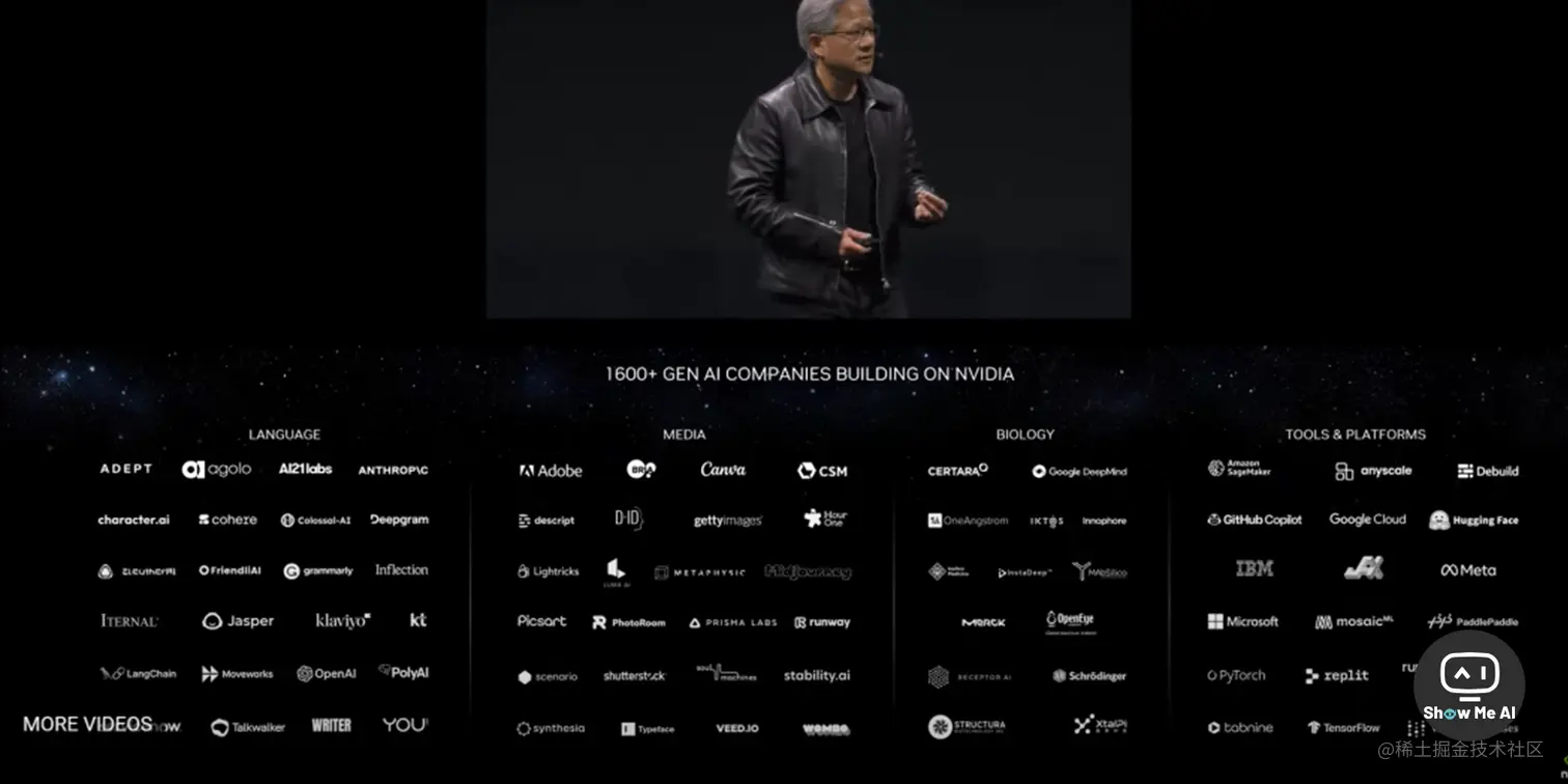 黄仁勋在最新一次演讲中,展示了NVIDIA在生成式AI领域的合作伙伴,这是从1600多家正在和NVIDA合作的公司种精选出来的81家,分为4类。这个系列分别介绍了公司名称和具体业务: