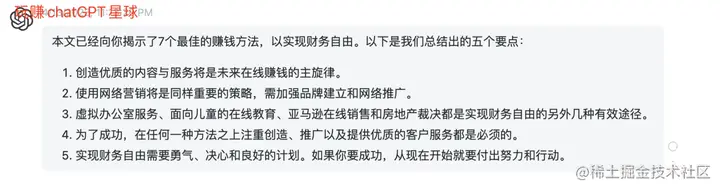 发送给ChatGPT: 为这个 XX主题 的文章编写一个简短且扼要的文章结尾。结尾最多200字。简要总结文章,并列出5个要点。要简洁。(如果你有更多的想法,可以直接在后面追加你想要补充的信息)