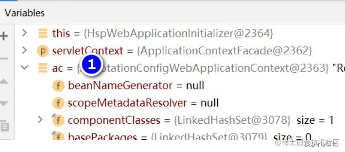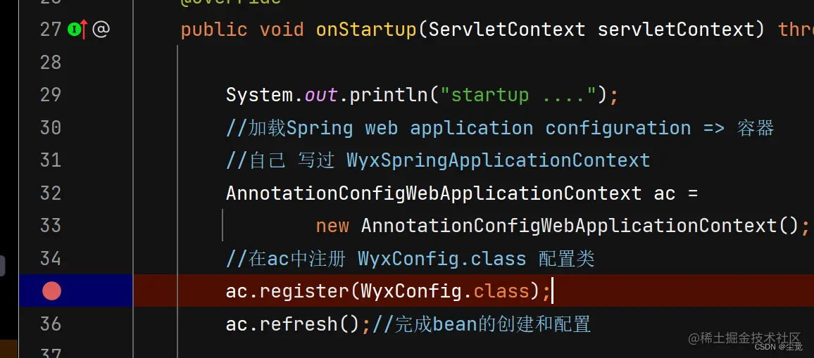 看看是否进行Spring 容器的初始化工作, 可以看到ac.refresh() 会将WyxConfig.class 中配置Bean 实例化装入到容器中.