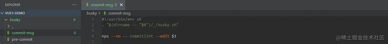 执行下面命令生成 commint-msg 钩子用于 git 提交信息校验,命令来自:@commitlint/README.md