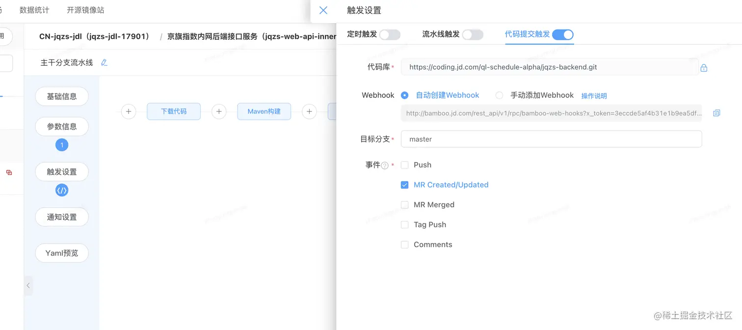 配合如上配置,我们在触发设置中,只需要设置MR created/Updated事件即可。如下图所示: