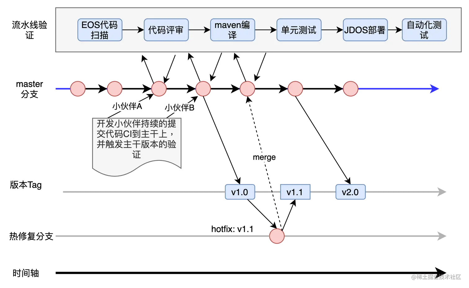 如图所示,研发小伙伴基于master分支开发,当每次merge时,都会触发流水线验证过程。在流水线验证中: