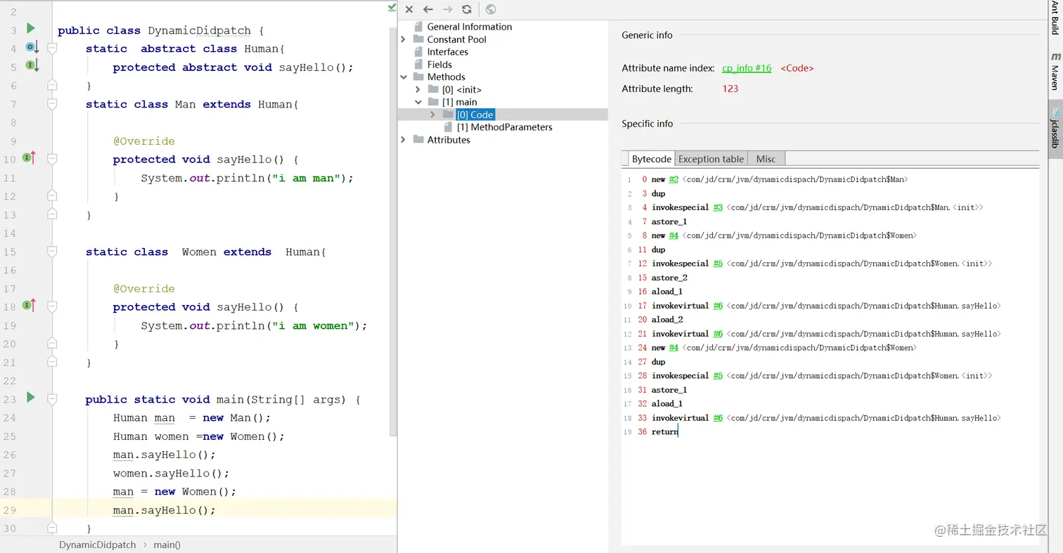 4.动态分配:如下图所示,man和women和重新man引用指向women然后方法调用sayHello,此时字节码显示的符号引用都是Human#sayHello,但是实际执行结果和指令码不一致,这是因为invokevirtual指令,在指令调用之前都会aload_x来加载实际的数据类型,这就是方法重写的本质