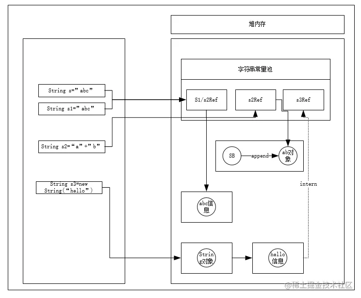 字符串常量池存放在堆内存(>=1.8)中,堆里边的字符串常量池存放的是字符串的引用或者字符串(两者都有),如下图描述字符串创建的堆分布