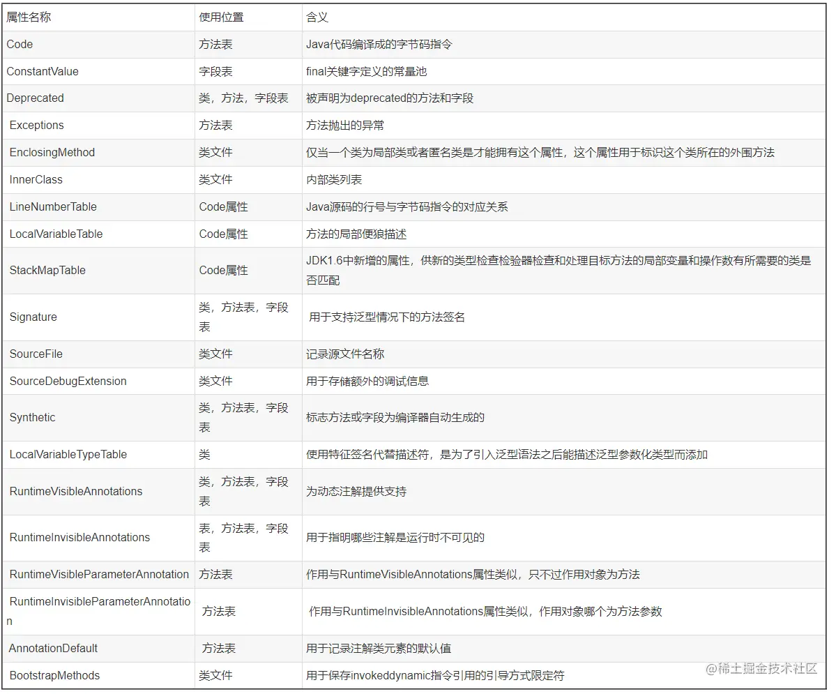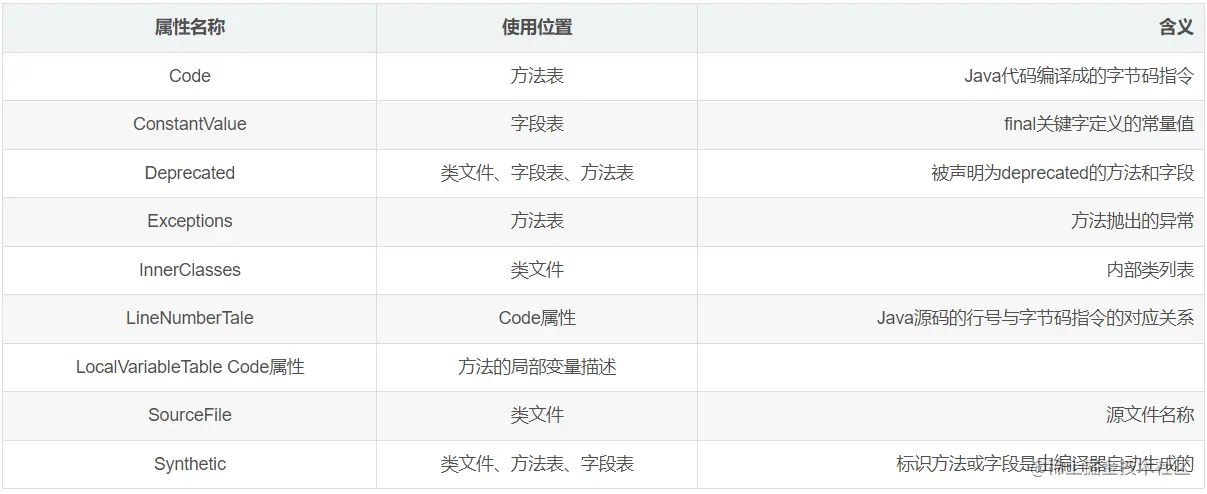 Class类文件是紧凑、顺序、无空隙的,魔数(MagicNumber)、Class文件版本(Version)、常量池(Constant_Pool)、访问标记(Access_flag)、本类(This_class)、父类(Super_class)、接口(Interfaces)、字段集合(Fields)、方法集合(Methods )、属性集合(Attributes)。其中因为java多继承所以interfaces接口类型为数组;attribute_info则是方法表中定义的code索引,指向具体的方法体字节码。如图1所示。