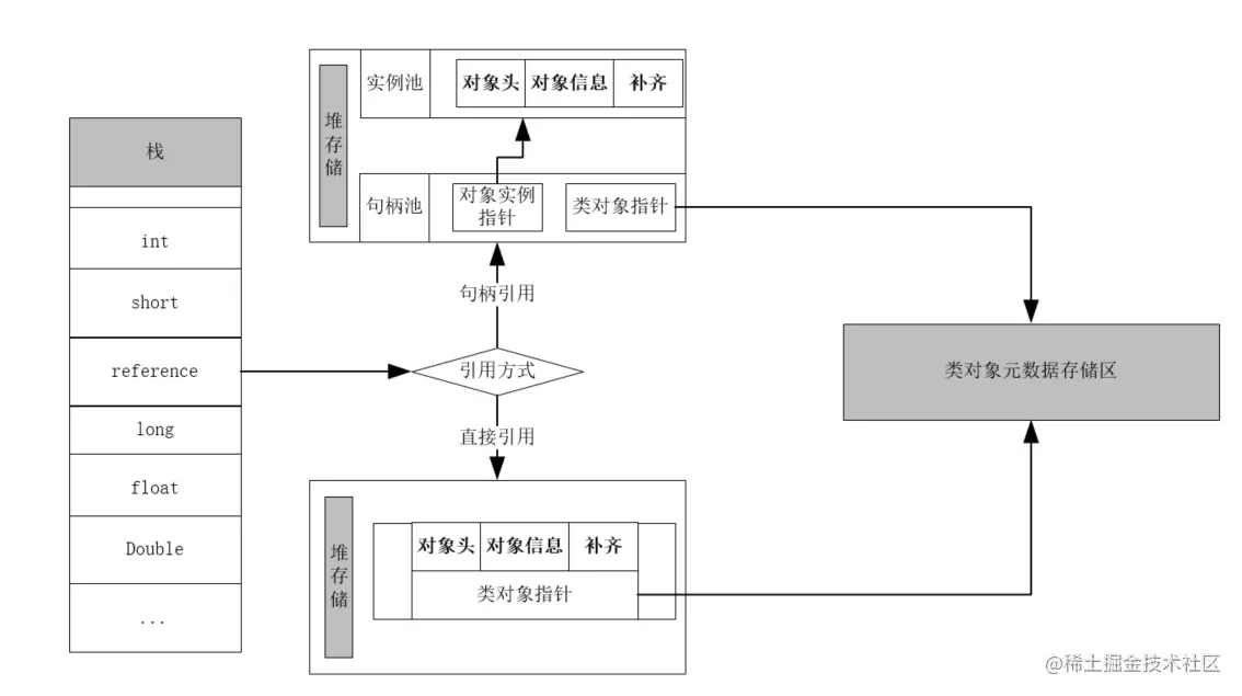 Java堆中将会划分出一块内存来作为句柄池,reference中 存储的就是对象