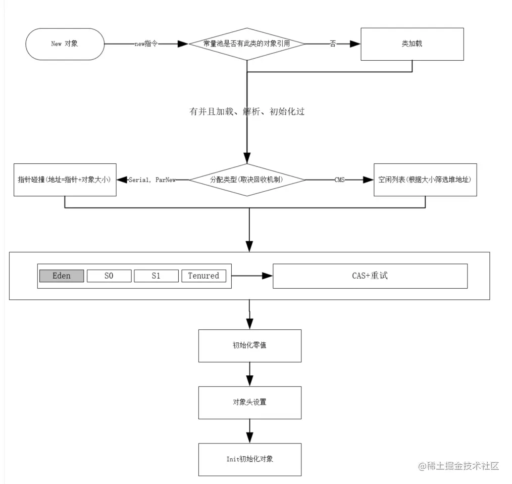 jvm碰到一个new指令,首先判断改指令指向的常量池的类全名是否被加载、解析初始化过,如果没有则进行类加载,参考类文件加载