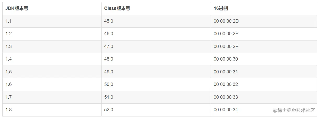 紧接着2个字节00表示次版本号为0 ;0034代表主版本为52(jdk版本号对应的jdk版本为1.8)参考jdk版本和class字节版本的对应关系