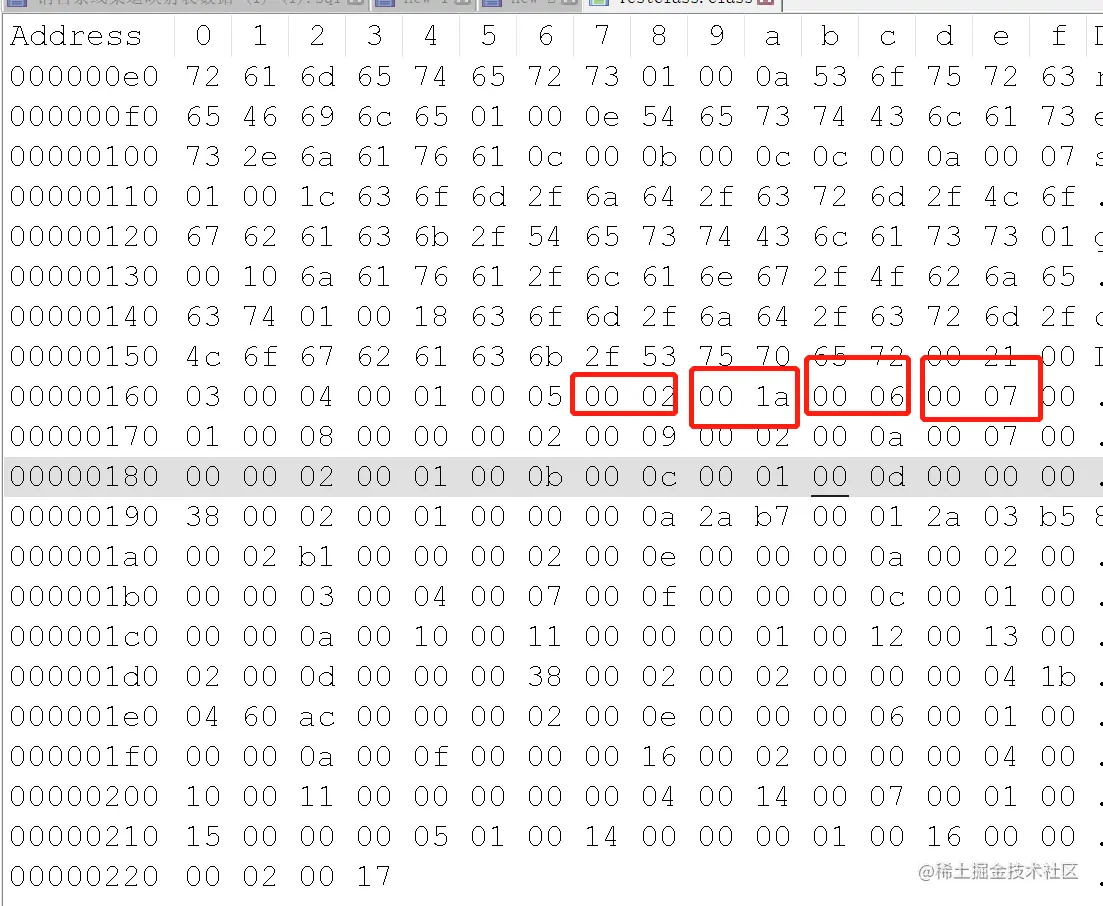 通过编译后生成class文件格式如下,因为class文件是以8位作为一个字节的二进制流。为了方便计算,用16进制表示二进制(1个字节=2个十六进制的数,故下面每2个数就代表1个字节)