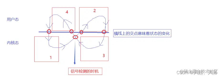 共分为四步 1.代码执行时,因为系统调用或者时间片到了,切换到内核态 2.返回用户态之前,先做信号检测,没有block(阻塞),已经被pending(收到) 由内核态切换到用户态,执行自定义的handler方法 3.执行handler方法后,在由用户态切换到内核态