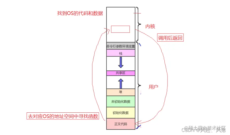 系统调用的本质:就相当于调用库函数中的方法,在自己的地址空间中进行函数跳转并返回