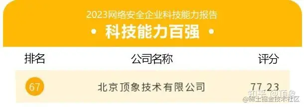 《2023网络安全企业科技能力报告》该报告基于企业科创成果力、专利质量力、持续增长力、创新转化力及人才建设力五大维度50多个细分指标建模进行量化计算,在该报告的“2023网络安全企业科技能力百强”榜单中,顶象排名67位。