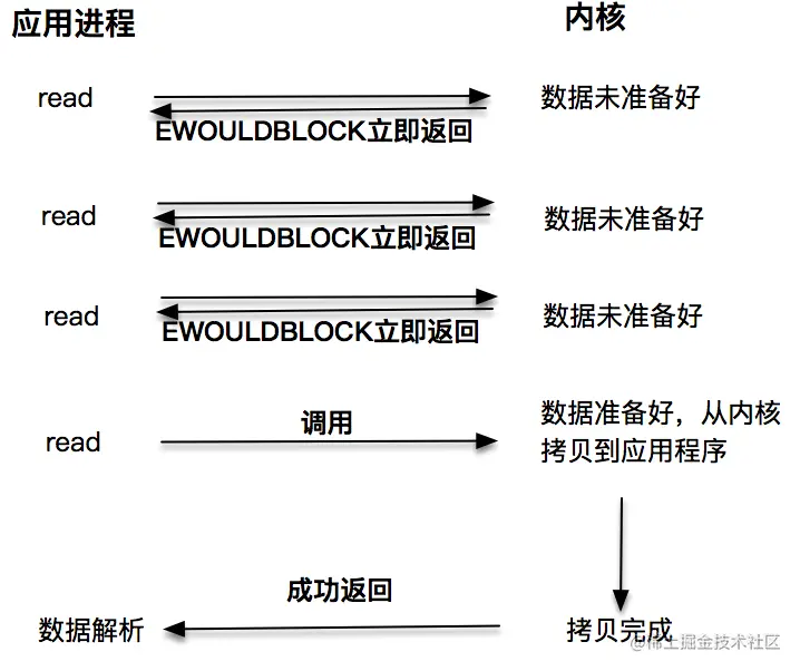 非阻塞的 read 请求在数据未准备好的情况下立即返回,应用程序可以不断轮询内核,直到数据准备好,内核将数据拷贝到应用程序缓冲,并完成这次 read 调用。注意,这里最后一次 read 调用,获取数据的过程,是一个同步的过程。这里的同步指的是内核区域的数据拷贝到缓冲区的这个过程。