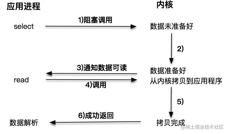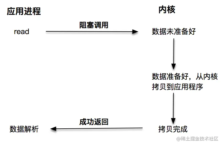 阻塞 I/O 发起的 read 请求,线程会被挂起,一直等到内核数据准备好,并把数据从内核区域拷贝到应用程序的缓冲区中,当拷贝过程完成,read 请求调用才返回。接下来,应用程序就可以对缓冲区的数据进行数据解析。