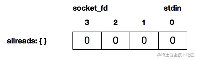 FD_ZERO(&allreads); // 12 行通过FD_ZERO 初始化了一个描述符集合,这个描述符读集合是空的: