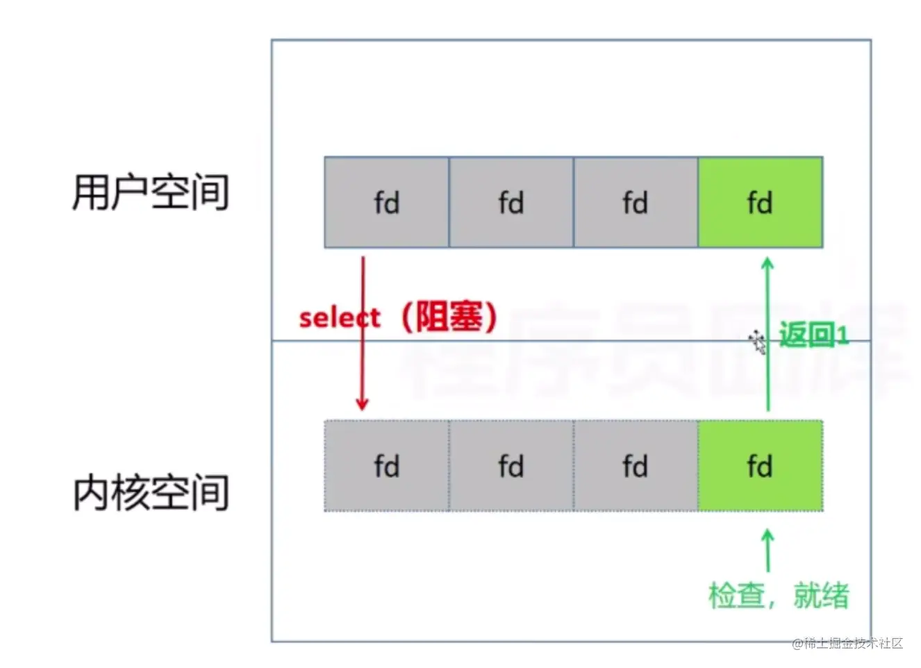 select阻塞后,会在内核空间循环遍历fd,直到遍历到某个fd数据就绪,打上标记(记录到fd_set里面),返回就绪fd的数量。