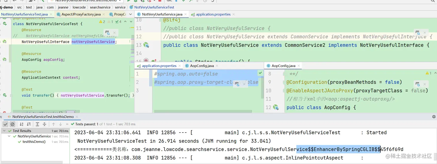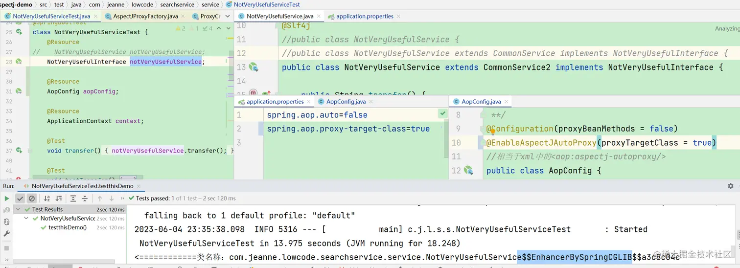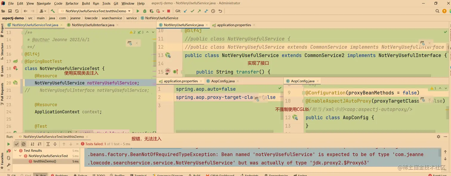 org.springframework.beans.factory.BeanCreationException: Error creating bean with name 'com.jeanne.lowcode.searchservice.service.NotVeryUsefulServiceTest': Injection of resource dependencies failed; nested exception is org.springframework.beans.factory.BeanNotOfRequiredTypeException: Bean named 'notVeryUsefulService' is expected to be of type 'com.jeanne.lowcode.searchservice.service.NotVeryUsefulService' but was actually of type 'jdk.proxy2.$Proxy63'