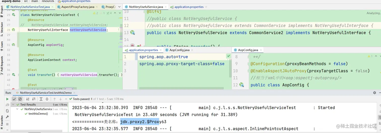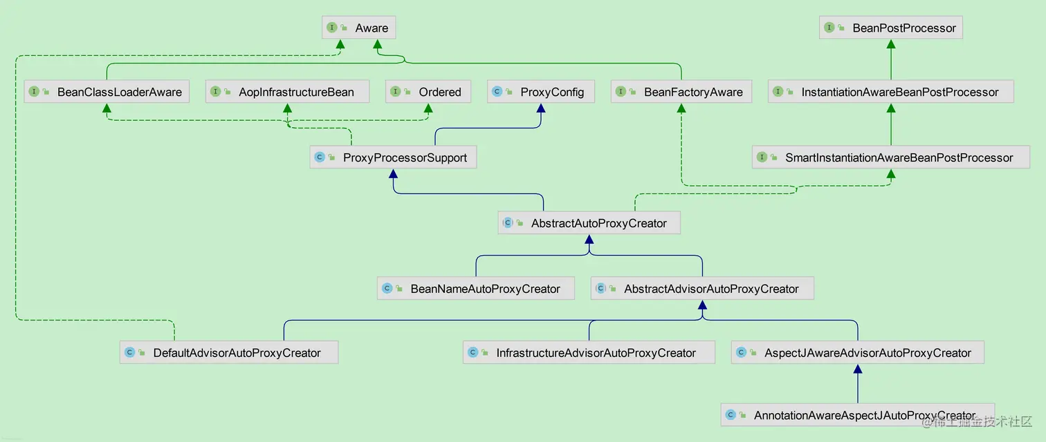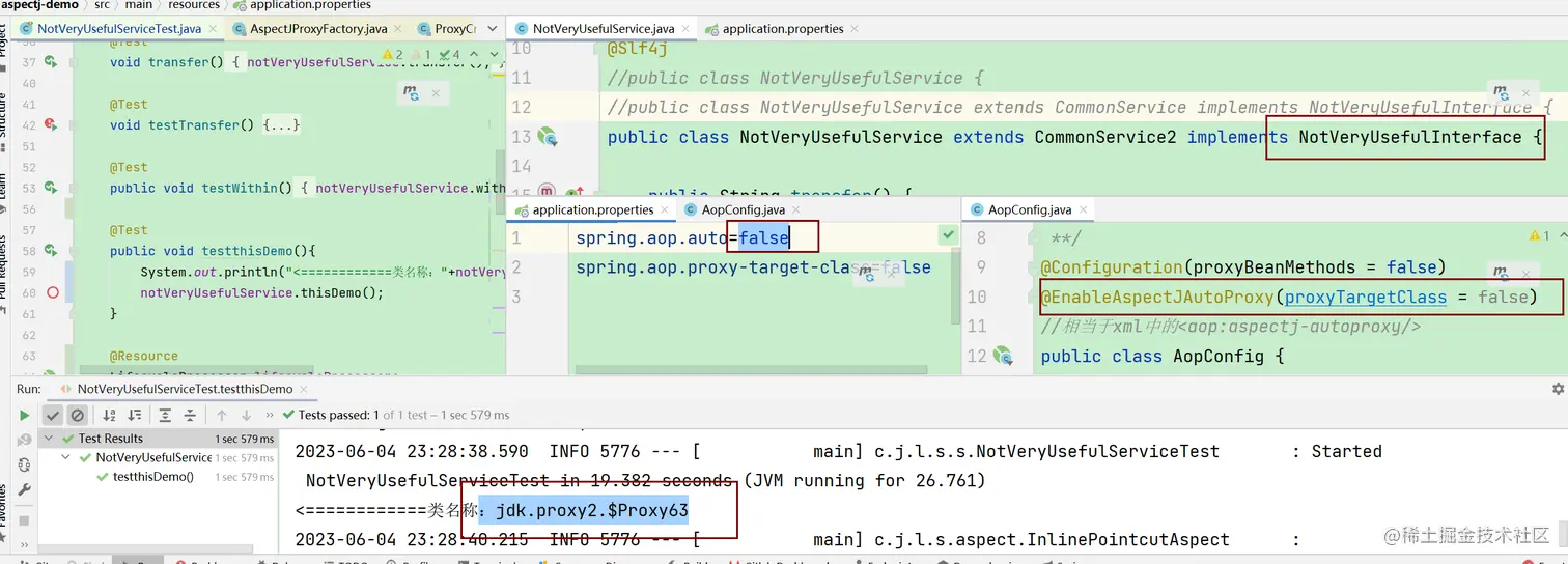 - proxyTargetClass 默认false,设置为true则强制使用CGLib代理。默认的话,如果目标类实现了至少一个接口,走JDK动态代理,否则cglib