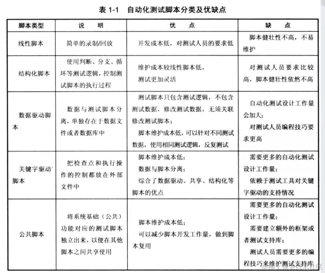 自动化测试脚本的分类说明及优缺点如表1-1所示