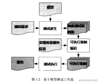 基于模型测试适用于采用“基于模型设计”的软件系统。在这种架构下,会有一个成熟的测试模型来描述测试数据的所有方面,以及测试案例和案例的执行环境。通常这一测试模型是全部或者从待测系统功能模型中提取出来的。测试模型描述了待测系统的抽象行为,因此从测试模型中可以派生出功能测试案例。这些测试案例构成了抽象测试案例集,不过抽象测试案例集不能直接在待测系统上执行。真正可以执行的测试案例集(可以与待测系统进行交互),是从抽象测试案例集派生出来的。有些基于模型测试的测试工具,支持从模型(包含足够信息)产生可执行测试案例集,如图1-1和图1-2所示。