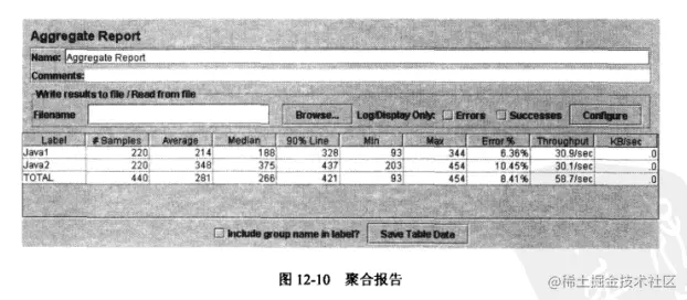 聚合报告会为测试中的每一个不同采样,在表格中创建一行统计值,如图12-10所示。对每一个采样,它都会统计服务器响应信息,并提供请求数目、Min、Max、Average、Error%、Throughput(requesr/second)及Throughput(Kilobytes per second)等统计值。一旦测试结束,那么吞吐率(Throughput)就是贯穿整个测试阶段的统计值。