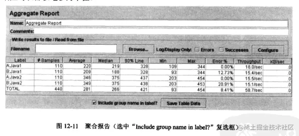 Label:采样标签。如果选中了“Include group name in label?”复选框,那么线程组的名称就会作为前缀,如图12-11所示,这样就能在必要的时候分线程组不同而标签相同的采样。