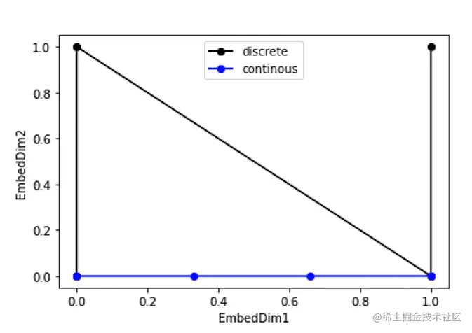 如果我们能把离散空间(黑色的线)转换到连续空间(蓝色的线),那么我们就能解决位置距离不连续的问题。同时,我们不仅能用位置向量表示整型,我们还可以用位置向量来表示浮点型。