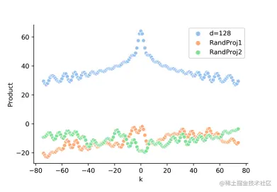 这里横轴的k指的就是,可以发现,距离是对成分布的,且总体来说,越大或者越小的时候,内积也越小,可以反馈距离的远近。也就是说,虽然位置向量的点积可以用于表示距离(distance-aware) ,但是它却不能用来表示位置的方向性(lack-of-directionality) 。
