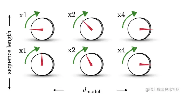 结合下图,来理解一下这样设计的含义。图中每一行表示一个,每一列表示中的第i个元素。旋钮用于调整精度,越往右边的旋钮,需要调整的精度越大,因此指针移动的步伐越小。每一排的旋钮都在上一排的基础上进行调整(函数中t的作用)。通过频率来控制sin函数的波长,频率不断减小,则波长不断变大,此时sin函数对t的变动越不敏感,以此来达到越向右的旋钮,指针移动步伐越小的目的。