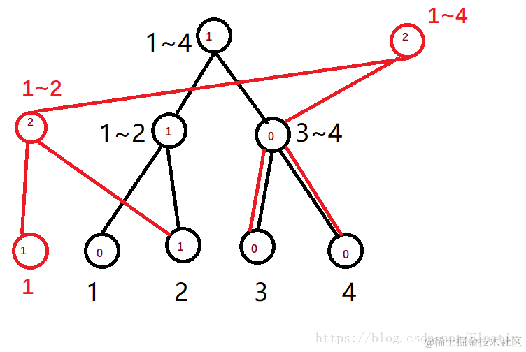 拿上面的图来说,因为数列1,2总共有两个元素而不是原来黑色树的一个,所以新建一个节点(最上面的红色那个) 然后我们发现右子树(3~4)在新树中和原来的一样,所以不做修改,直接把右子树连到新的根节点上面 再看左子树,发现发生了变化,所以创建新点, 然后以此类推,就可以得到新的线段树(红色) p.s. 红色是前两个元素(2,1)的树