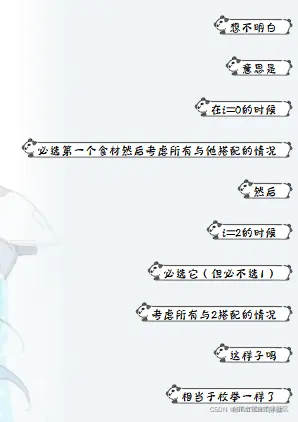 起初思路就是:要搜索所有搭配方式,更新最小值嘛,但是又有点不知道怎么写,就是不知道怎么跳过选不同的配料嘛,然后 就参考了一下别人写的,然后写了这个代码(过了):