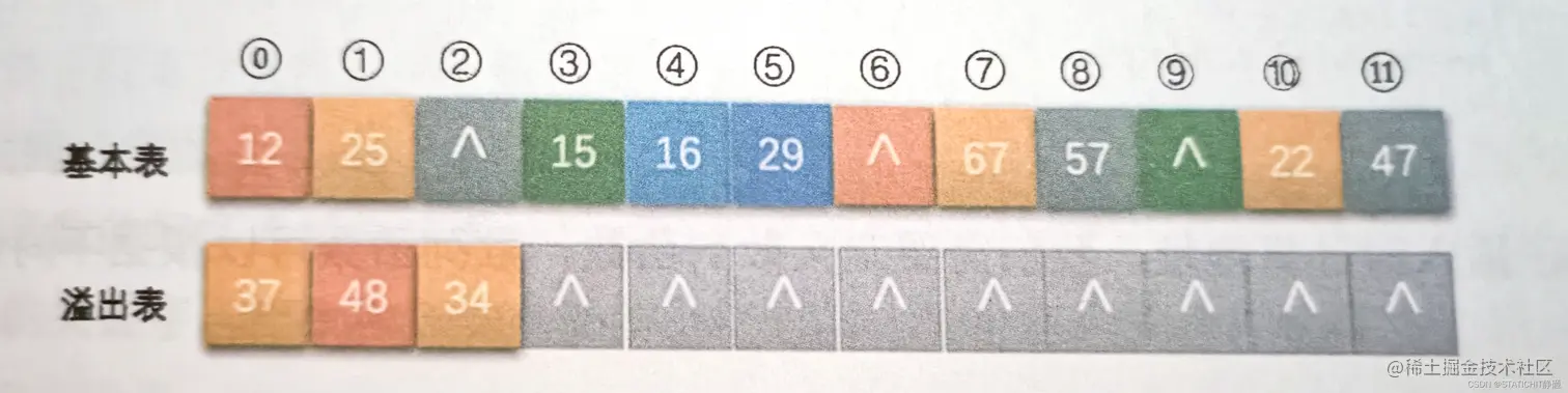 为所以的有冲突的关键字建立一个公共的溢出区来存放。在查找时,先于基本表的相应位置进行比对,如果不相等再去溢出表顺序查找,这种方法适合冲突不多的情况。