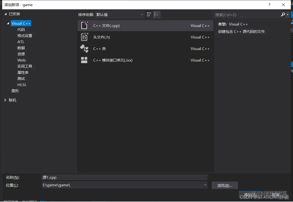 右键点击源文件->添加->新建项->第一个C++文件(.cpp)->填入文件名称->创建源文件