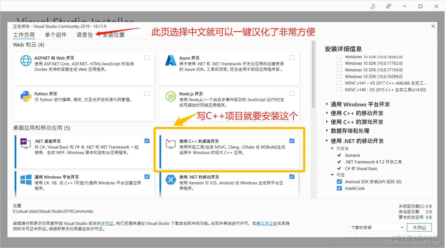 工作负荷页面根据需勾选相应的负载,如果是写c/c++项目勾选图中所圈,看到的右下角会是安装选项,点击安装即可。