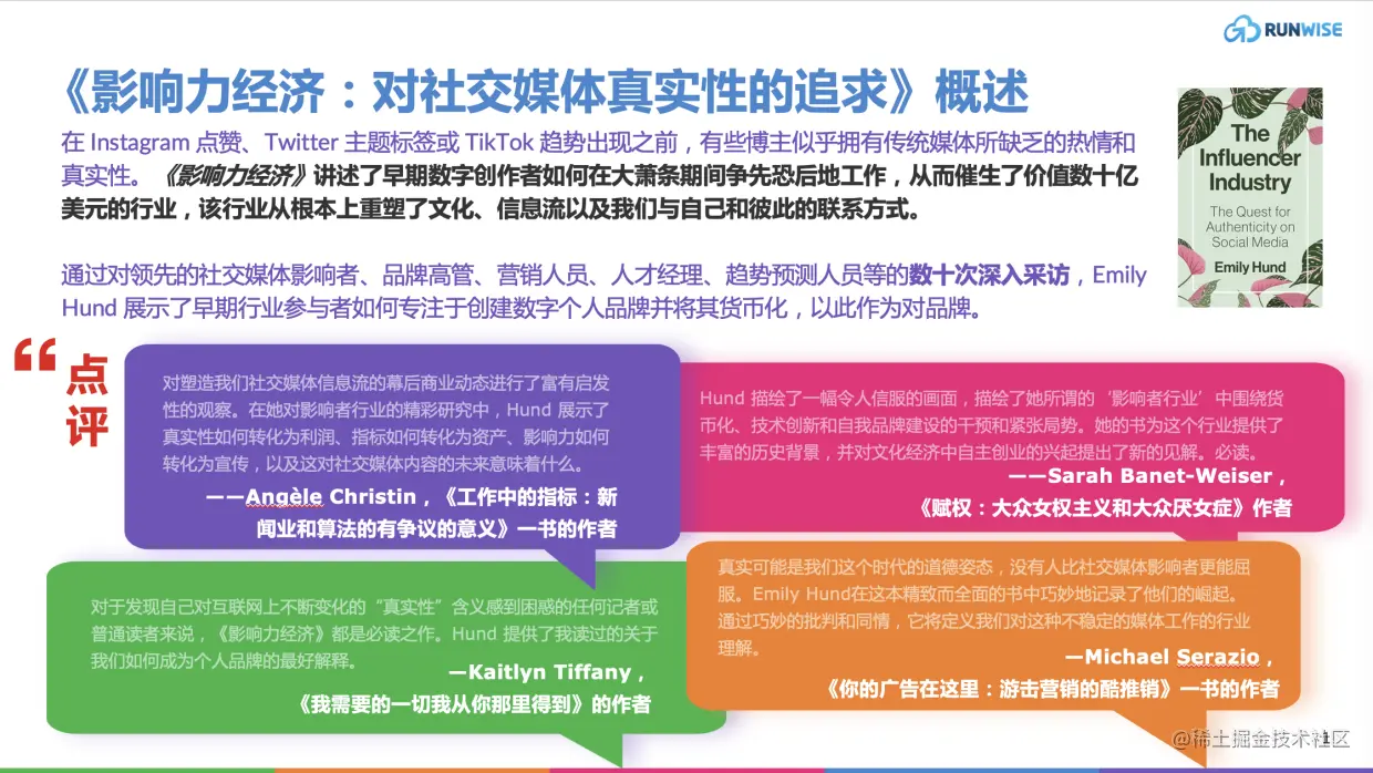 《影响力经济》让我们了解到,我们从社交媒体上看到的“影响”是由一系列产业发展的结果,它的本质不仅仅是一种媒介,而是一种以宣传、合作伙伴关系和营销内容为中心的社会市场经济活动,受到技术和资本的推动。这本书为我们揭示了社交媒体影响者究竟是什么,以及社交媒体影响力产业如何改变我们的社会、文化和经济以及我们的网络空间,这让我们能够更深入地了解影响力。