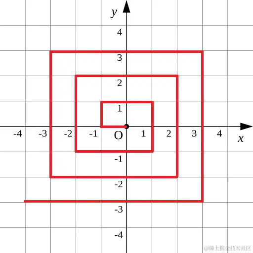 对于整点(X, Y),我们定义它到原点的距离dis(X, Y)是从原点到(X, Y)的螺旋折线段的长度。