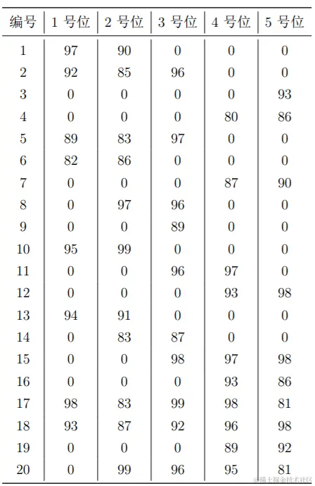 每位球员担任 11 号位至 55 号位时的评分如下表所示。请你计算首发阵容 11 号位至 55 号位的评分之和最大可能是多少?