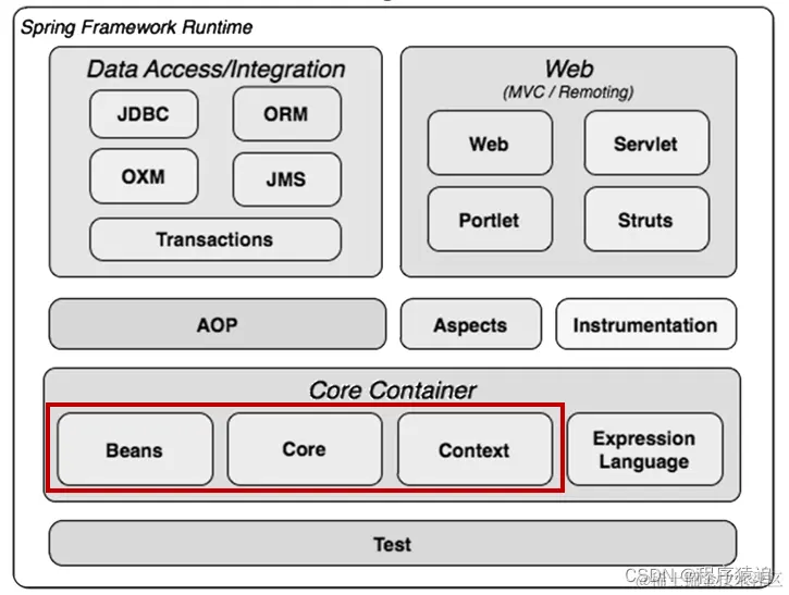 - 核心容器:核心容器提供 Spring 框架的基本功能。核心容器的主要组件是 BeanFactory,它是工厂模式的实现。BeanFactory 使用控制反转(IOC) 模式将应用程序的配置和依赖性规范与实际的应用程序代码分开。