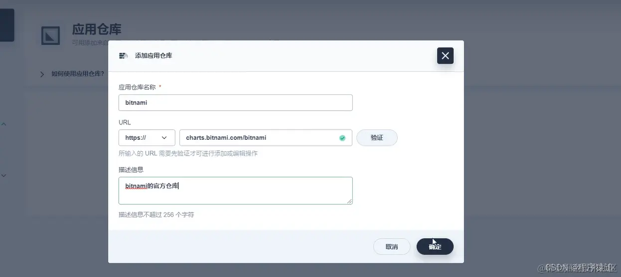 点进去会看到一个链接,复制一下,然后在 KUBESPHERE 用个分公司的老板账户来登入(详细洁之前的文章),在应用管理——>应用仓库,里面进行添加仓库,粘贴链接,记得点下验证。
