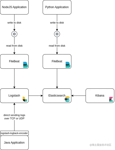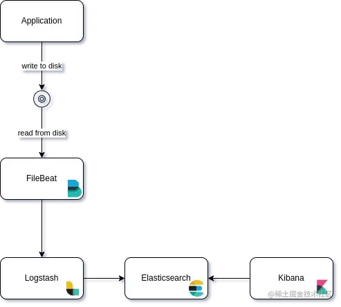 1)Application -> Filebeat -> Logstash -> Elasticsearch
