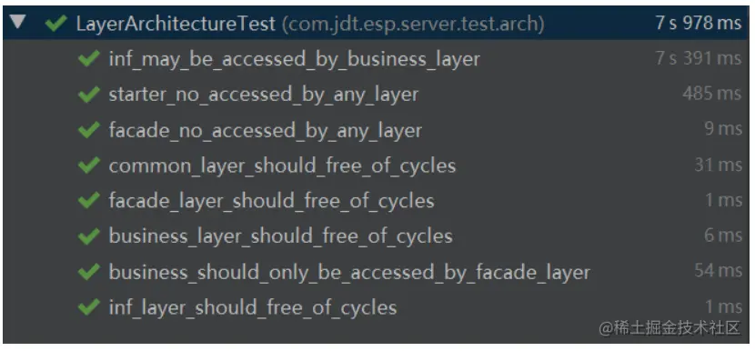 在IDE下执行Archiunit单元测试结果示意如下图所示: