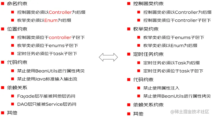 从规范复用的角度考虑,团队需要定义统一的开发规范,包括但不限于编码规范、异常规范、命名规范、依赖规范等等,并在团队内达成一致。建议采用统一的、文档化的形式进行记录(比如,在线表格系统)。对于每条开发规则建议增加比如 “正例”、“反例”、“规则描述”、“规则详细说明”、“是否可自动实现” 等维度描述信息