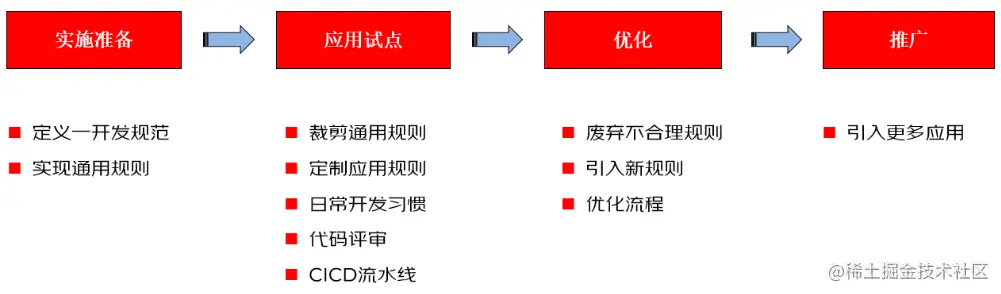 - 复盘优化:基于试点效果进行复盘,基于团队成员反馈进行架构规则优化、已有规则的修改及废弃等等