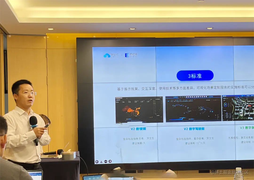 随后由易知微业务总监虎强进行相关主题分享,他指出基于展示效果、交互深度、使用技术等多方面差异,可视化场景定制服务的实施标准可以分为数字驾驶舱、数字孪生等,其中数字驾驶舱具备复杂地图服务、复杂图标和深交互,建设周期为10-15天,而数字孪生可以做到真实场景复刻、多场景联动等。