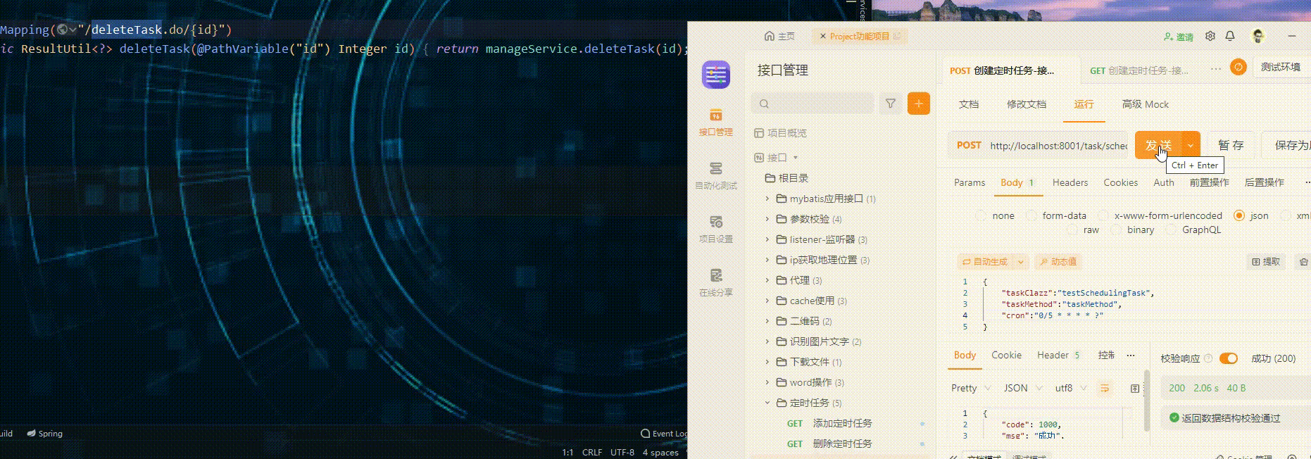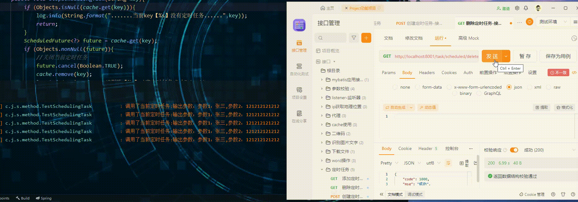 我们创建了三个方法,分别是: addTask,editTask,deleteTask来实现定时任务的删除,添加,具体实现参考上面代码。看看执行结果: