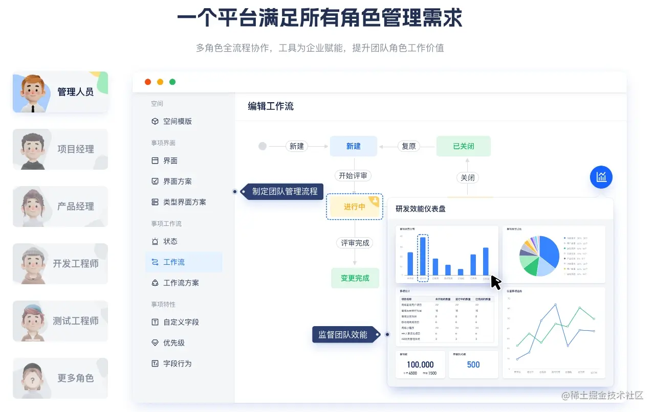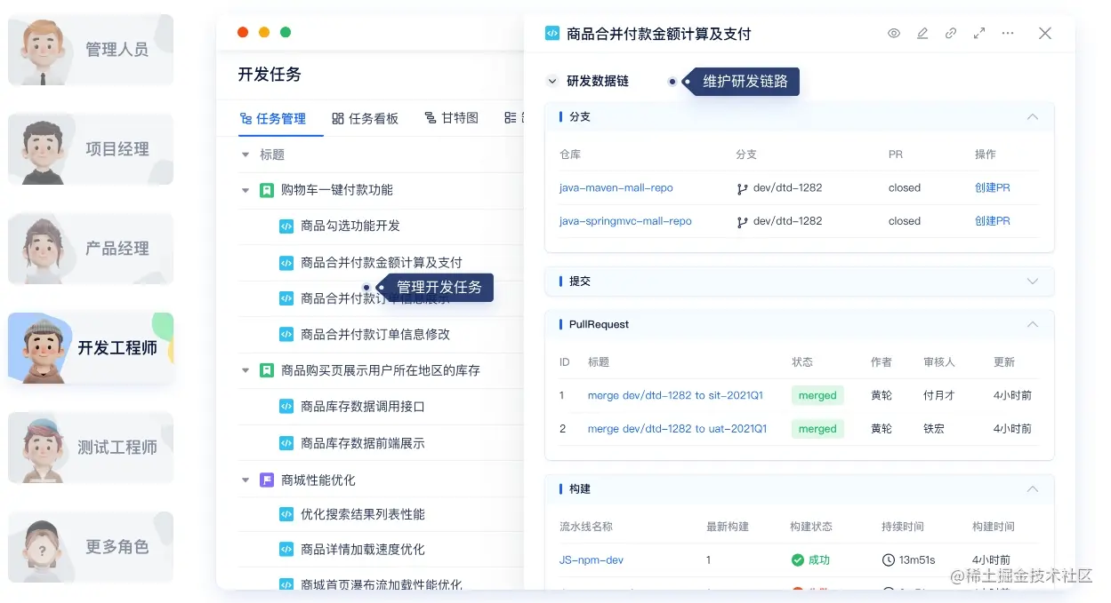 在该行全新的研运一体平台之中,还包含了企业级项目管理平台 Gitee Team ,驱动该银行研发团队管理自己的数据资产。 当“业务意向”提出后,便会被拆解成不同的事项类型(Epic/Feature/Story/Task等)分配给不同的角色,通过审批、设计、实现、测试,再到投产,该研运一体化平台为各种角色提供了结合先进管理方法论的工具实践,实现了全程在线协作。