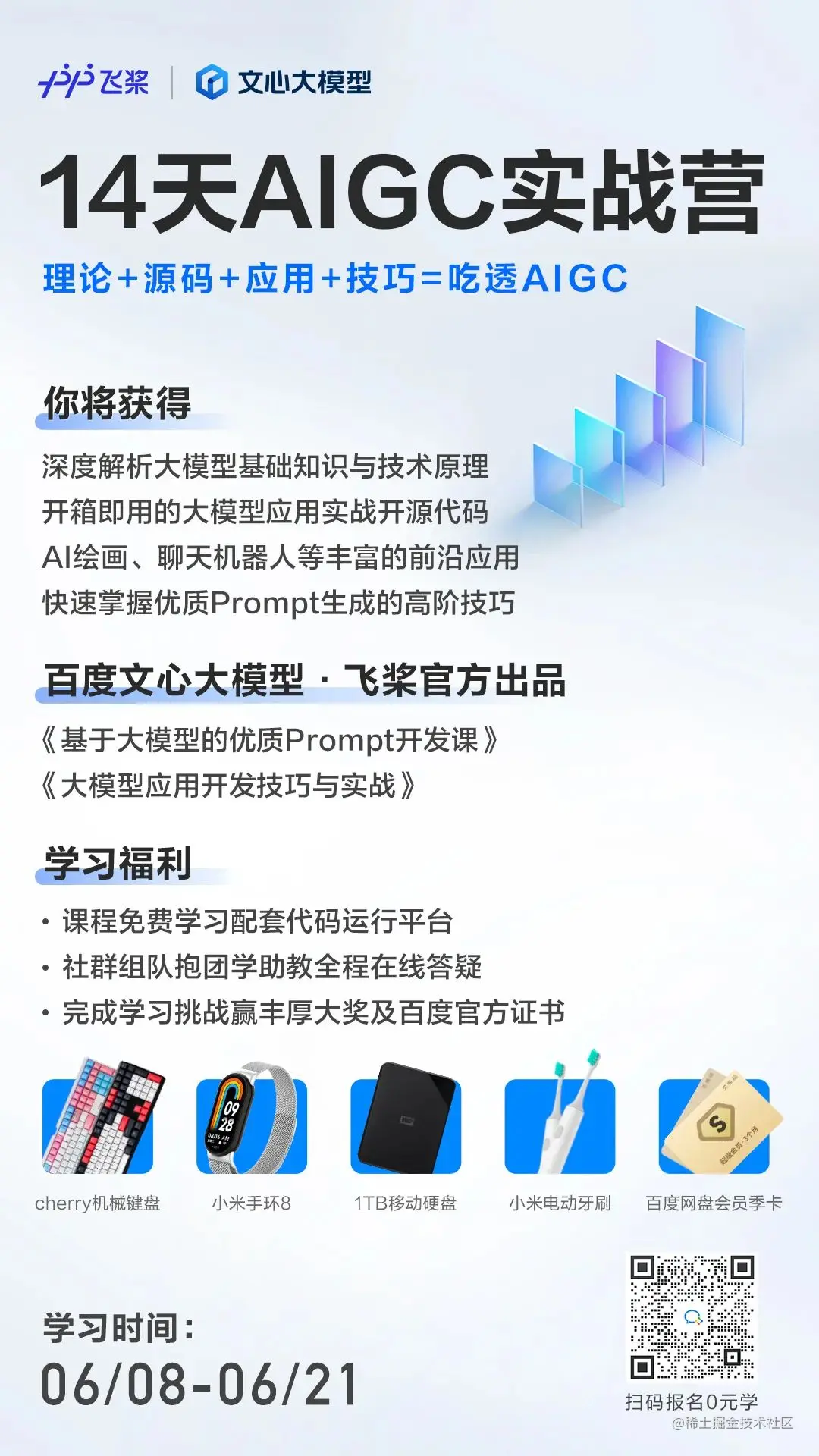 国内外大模型产品格局,AI产品正在快速融入我们的工作和生活—图源自InfoQ研究中心今天,百度飞桨 AI Studio 为处于时代漩涡的你,提供了一次免费的绝佳学习机会——14天 AIGC 实战营!带你躬身入局,抓准 AIGC 红利!文心大模型联合飞桨官方出品课程 14天带你吃透AIGC!