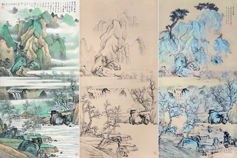 左:乐震文完成稿 中:陆小曼未尽稿 右:百度文心一格完成稿